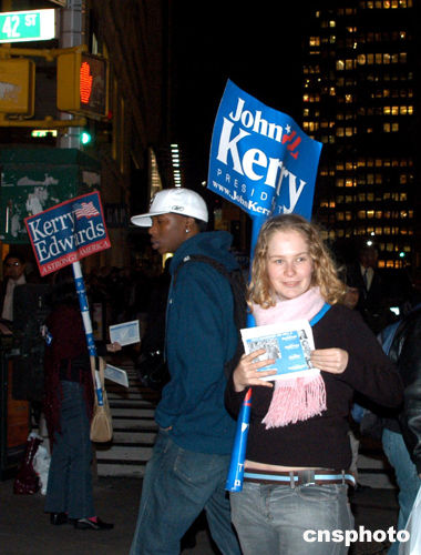 當地時間十一月二日,美國進行總統大選。當天晚上距離紐約州投票結束還有三個小時的時候,克里的支持者還鍥而不舍地在紐約時代廣場派發傳單,呼吁選民投票給克里。作者:趙海燕