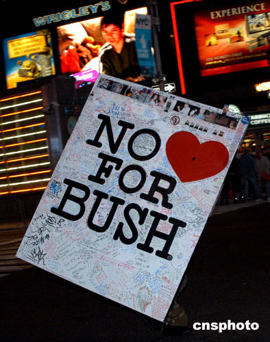 當地時間十一月二日,美國進行總統大選。當天晚上距離紐約州投票結束還有三個小時的時候,一個小伙子搬著一幅巨大的反布什標語牌出現在紐約時代廣場。作者:趙海燕