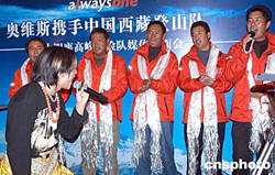 西藏登山隊明年將與奧維斯體育文化傳播公司繼續共同推進“2004-2008地球第三極珠峰環保大行動”,清理海拔6500米-8000米間的登山遺棄物。十一月十三日,合作雙方在北京秀水南街的一個西藏風情餐吧舉行媒體見面會,圖為登山隊隊長桑珠(右五)、橫跨珠峰第一人次仁多吉(右四)、13高峰攀登者邊巴扎西(右三)、仁那(右一)及雪山之子洛則與公眾見面。中新社記者:鄒憲