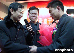 | 十一月二十六日,中國(guó)造血干細(xì)胞捐獻(xiàn)者資料庫(kù)志愿者突破二十萬(wàn)人份新聞通報(bào)會(huì)在北京召開(kāi)。據(jù)了解,中國(guó)造血干細(xì)胞捐獻(xiàn)者資料庫(kù)自二零零一年重新啟動(dòng)以來(lái),到目前已有一千六百多位患者配型成功,并已有一百八十一位志愿者捐獻(xiàn)了造血干細(xì)胞。但是,目前造血干細(xì)胞資料庫(kù)離現(xiàn)實(shí)需要仍有較大差距。圖為捐獻(xiàn)者張德柱(右)與白血病康復(fù)者鄒隆錦(左)首次見(jiàn)面。作者:韓藝冰