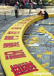 工人正在澳門佑漢公園趕制喜慶牌匾,為慶祝澳門特別行政區(qū)成立五周年,十八日澳門街坊總會(huì)將在此地舉辦“金蓮?fù)缕G齊鼓舞,彩燈璀璨慶回歸”系列大型慶祝活動(dòng)。作者:梁永強(qiáng)
