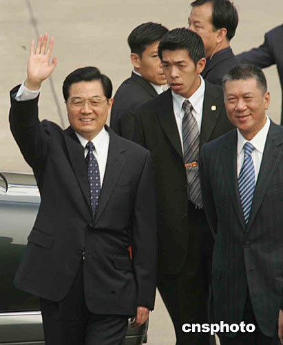 國家主席胡錦濤乘專機抵達澳門國際機場。圖為他向前往采訪的記者揮手致意。作者:董會峰