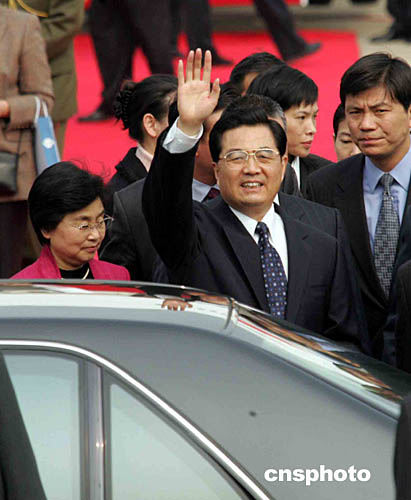胡錦濤在何厚鏵的陪同下,向歡迎的當地民眾揮手致意。