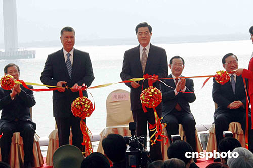 接著,胡錦濤主席與何厚鏵先生一同為西灣大橋落成剪彩。臺(tái)下再次響起熱烈的掌聲。
