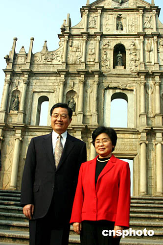 在澳門特首何厚鏵夫婦陪同下,胡錦濤和夫人劉永清等走下一段臺階,以大三巴為背景留影。就在眾人以為胡主席就此離開時,胡錦濤似乎為遠處的歡呼聲所吸引,他徑直向臺階下面走來。警衛人員前呼后擁,神經高度緊張。