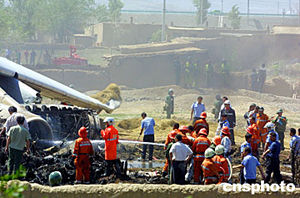 記者在事發(fā)后一小時趕到現(xiàn)場,發(fā)現(xiàn)已有數(shù)十輛消防車停在失事飛機周圍,身著橙紅色消防衣的警察已走進飛機內(nèi)部進行消防工作。在離失事飛機約三十米的一塊空地上,早已停滿了各式車輛,約有近千名武裝警察在維持秩序,他們甚至動用了大狼狗。