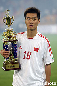 二○○六年德國世界杯男子足球賽亞洲區預賽中國隊對馬來西亞隊的比賽六月九日晚在天津舉行,中國隊以4:0取勝,獲得預選賽小組賽三連勝。李霄鵬獨中二元,被評為本場比賽最佳球員。中新社記者:毛建軍