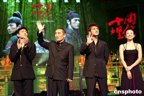 七月十日晚,影片《十面埋伏》在北京舉行盛大的全球首映慶典,影片主要創作人員劉德華、張藝謀、金城武、章子怡(從左到右)盛裝出席。作者:高遠