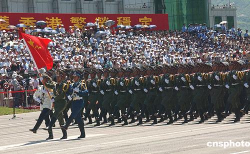 8月1日,香港回歸七年來,駐港部隊今天首次公開閱兵,包括政府高官、社會名流和眾多第二屆立法會議員在內的逾一萬五千名香港市民,在新界石崗軍營親睹了陸海空三軍逾三千官兵參加的隊列操演。