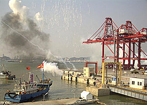 7月24日下午3時左右,隨著三發(fā)紅色信號彈升空,眾多艘民船商船在福建省廈門灣南岸的漳州港海面上集結,船上裝載著武器裝備和人員,這些船迅速與海面部隊對接。