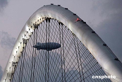 當時時間8月10日晚,一架監視飛艇從雅典主體育場上空飛過。體育場的巨大拱梁恰似一架巨大的豎琴,與飛艇共同奏出和諧的音符。這里正在舉行最后一次開幕式彩排。中新社記者:張煒