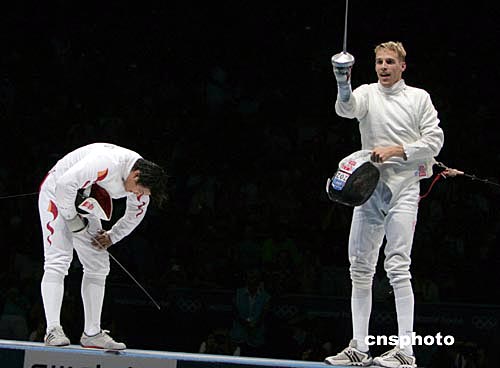 當地時間8月17日晚,中國劍客王磊在雅典奧運會男子重劍決賽中以9:15不敵瑞士名將費舍爾,獲得亞軍。中新社記者:任晨鳴