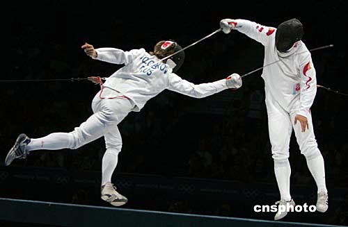 當地時間8月17日晚,中國劍客王磊在雅典奧運會男子重劍半決賽中擊敗俄羅斯選手獲得決賽權。中新社記者:任晨鳴