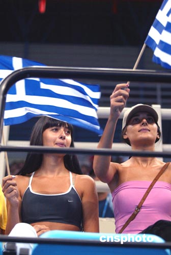 當地時間8月18日,男子柔道90公斤級比賽場邊,兩個漂亮的觀眾不停揮舞著希臘國旗助威加油。