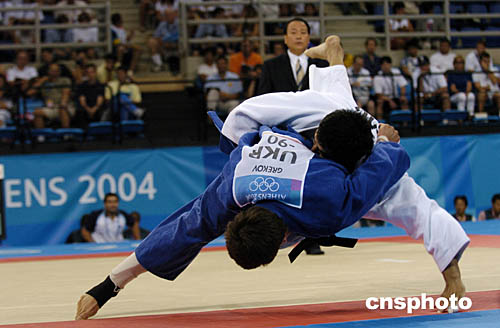 圖為在當地時間18日舉行的男子-90公斤級柔道比賽中的場面。選手們不時上演精彩的“武俠大片”。