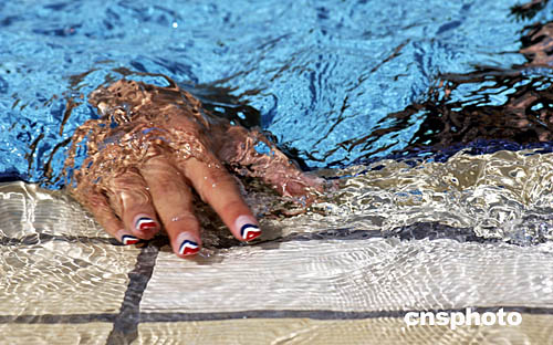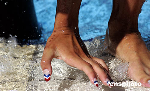 圖為17歲法國(guó)選手曼納多在女子800米自由泳比賽中,秀出自己繽紛指甲。她在先前進(jìn)行的女子400米自由泳比賽中為法國(guó)隊(duì)贏得了第一枚金牌。