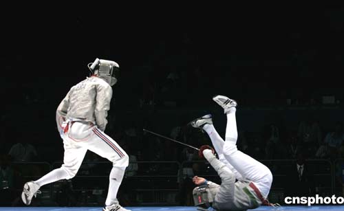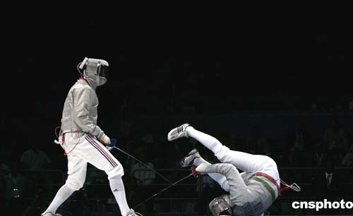 圖為當地時間8月19日進行的男子擊劍團體賽中,獲得冠軍的法國隊在決賽中對陣意大利隊的場景。