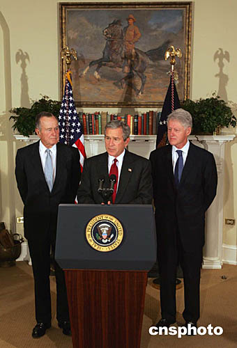 中新網1月4日電 據美聯社報道,3日,美國總統布什與該國兩位前總統——他的父親老布什以及他的前任克林頓一道,呼吁美國人打開他們的錢包,為在印度洋海嘯中幾百萬無家可歸的災民募捐。