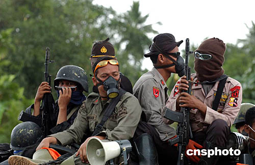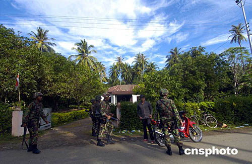 1月9日,在印度尼西亞班達亞齊災區,軍警荷槍實彈嚴防叛軍襲擊,災區善后仍在繼續,賑災情況嚴峻。作者:洪少葵