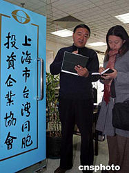 兩岸臺商春節(jié)包機(jī)方案剛落定,一月十九日,已經(jīng)有一千四百多臺商到上海臺胞投資企業(yè)協(xié)會登記訂票意向。圖為該協(xié)會副會長謝力軍(左)向記者介紹臺商預(yù)定機(jī)票的情況。作者:潘索菲