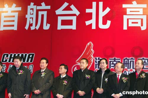 國航、海航首航臺北高雄儀式一月二十九日在北京首都國際機場舉行,國臺辦主任陳云林(左二)、副主任李炳才(左三)、國家民航總局局長楊元元(左一)、北京市副市長張茅(右四)、臺灣國民黨籍民意代表章孝嚴(右二)等出席儀式。作者:滿會喬