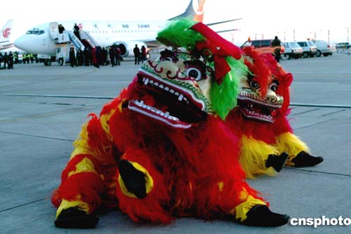 中國國際航空公司的CA1087/8航班一月二十九日上午七時四十六分從北京首都國際機場出發飛往臺北,這是五十六年來大陸民航班機首度飛往臺灣。圖為首航儀式上的舞獅表演。作者:滿會喬
