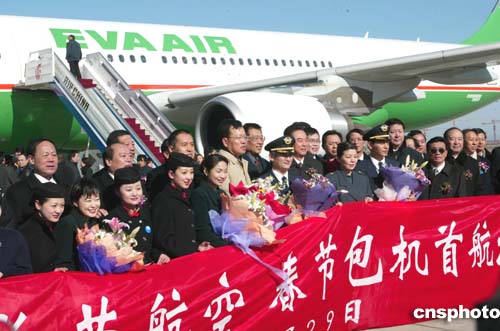 臺(tái)灣長(zhǎng)榮航空公司的民航班機(jī)一月二十九日十二時(shí)二十二分飛抵北京首都國(guó)際機(jī)場(chǎng),這是五十六年來(lái)臺(tái)灣民航航班首度飛抵北京。國(guó)臺(tái)辦主任陳云林、副主任李炳才、國(guó)家民航總局局長(zhǎng)楊元元、北京市副市長(zhǎng)張茅、臺(tái)灣國(guó)民黨籍民意代表章孝嚴(yán)等前往祝賀。作者:滿會(huì)喬