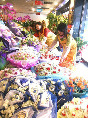 2月14日是“情人節(jié)”,南京各大花店準(zhǔn)備制作的百合、玫瑰、郁金香等各種手捧鮮花,已擺滿了店堂,供情侶們前來(lái)挑選。圖為太平北路一家花店的員工在忙著擺放剛制作的手捧鮮花。作者:谷昌旺