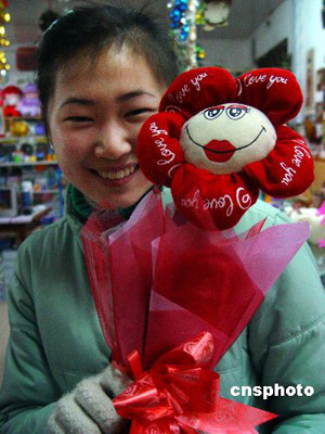 2月13日,在仙居縣一禮品商場(chǎng),女青年在挑選“會(huì)說話”的“電動(dòng)玫瑰”。這種用布娃造型的玫瑰,內(nèi)安裝了馬達(dá)和發(fā)聲器,輕搖“玫瑰”會(huì)發(fā)出“我愛你”之類的聲響!扒槿斯(jié)”前夕,商家挖空心思、別出心裁推出“會(huì)說話”的電動(dòng)玫瑰,深受青年朋友喜愛。作者:華文武