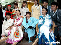 香港演員張文慈等身著韓國(guó)服飾20日亮相香港旺角鬧市區(qū)﹐為韓劇《茶母》宣傳造勢(shì)。作者:趙振清