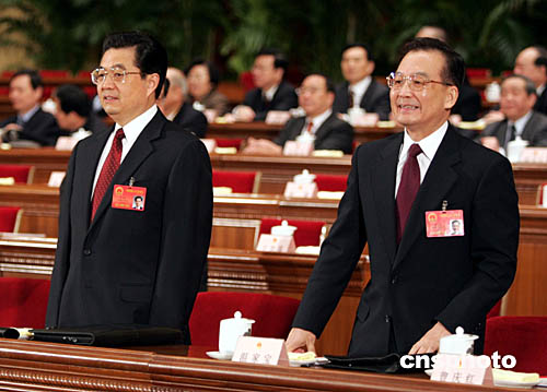 十屆全國(guó)人大三次會(huì)議三月五日在北京人民大會(huì)堂開幕,國(guó)家主席胡錦濤、國(guó)務(wù)院總理溫家寶在主席臺(tái)上就座。作者:毛建軍