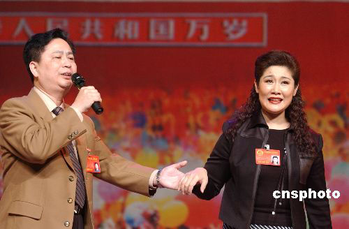 出席十屆全國人大三次會議的湖北、湖南、遼寧、臺灣代表,三月五日晚在駐地北京五洲大酒店舉行聯誼會,湖北代表劉丹麗(右)與臺灣代表何大欣共唱一首民歌《月之故鄉(xiāng)》,慶祝大會開幕。作者:毛建軍