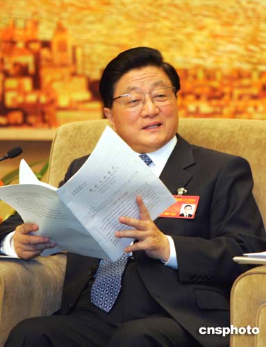 中共中央政治局常委、國務院副總理黃菊,三月六日到全國人大上海代表團和代表們一起審議政府工作報告。作者:湯彥俊