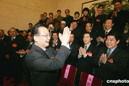 國務院總理溫家寶三月五日下午與出席十屆全國人大三次會議的甘肅代表一起審議政府工作報告。作者:毛建軍