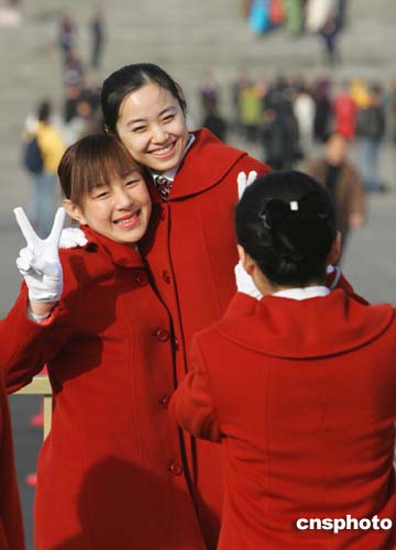 圖:“兩會”禮儀小姐在天安們廣場沐浴三月陽光