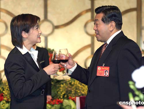 全國政協辦公廳、中央統戰部三月九日在北京釣魚臺國賓館舉行港澳地區政協委員招待會。香港嘉賓吳小莉向全國政協主席賈慶林祝酒。作者:王辛莉