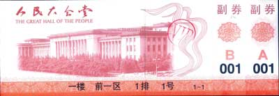 陽光下就可以看到票面內的水印,不過人民幣上是毛主席頭像,這里是“人民大會堂”等字樣;新票上還有同人民幣差不多的金絲線。此外新票也有熒光顯示,在驗鈔機下,“人民大會堂”幾個字會發出藍光,和鈔票上的“中國人民銀行”效果一樣。據悉新票還有其他防偽措施,但為保密起見,人民大會堂工作人員拒絕向外透露。不過據演出方介紹,入場時你會發現所有的入口都有一臺驗鈔機,驗鈔機擔任起了驗票的功能,所有人必須由這臺驗鈔機驗票才能進場。