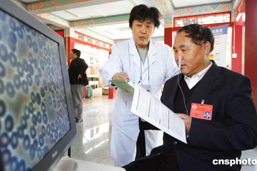 全國政協十屆三次會議三月十一日下午休會半天,圖為醫務人員在友誼賓館駐地為參會的委員們做免費健康咨詢。作者:湯彥俊