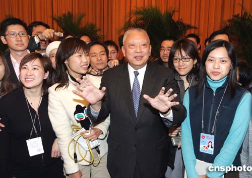 全國政協十屆三次會議三月十二日下午閉幕后,新當選的全國政協副主席董建華在北京政協禮堂舉行新聞發(fā)布會,并與現場采訪的香港記者們合影。作者:毛建軍
