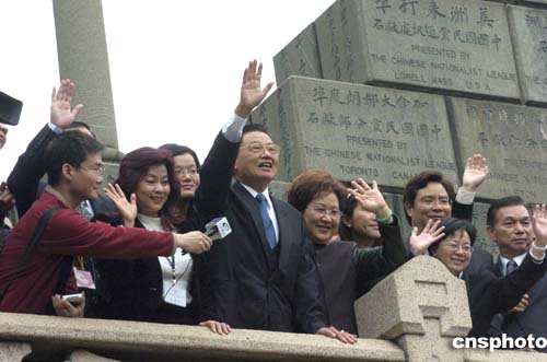 祭奠完畢,江丙坤與隨行成員登上七十二烈士紀(jì)功坊,輕輕撫摩著碑坊、細(xì)細(xì)閱讀著七十二烈士的英勇事跡。期間,江丙坤兩度回首,向坊下瞻望的民眾揮手致意,大家則報(bào)以熱烈的掌聲和問(wèn)候聲。