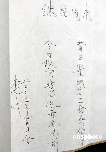 中新網4月28日電(記者 任晨鳴)中國國民黨主席連戰一行4月28日下午到北京故宮參觀,在乾清門前揮筆寫下與夫人方瑀共同撰寫的對聯。上聯:昔日禁城百年滄桑難回首。下聯:今日故宮幾番風華齊向前。橫批:繼往開來。