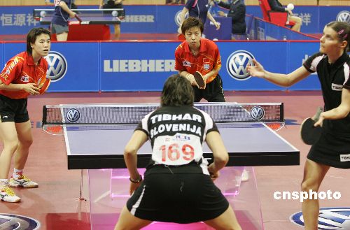 五月一日,第四十八屆世乒賽在上海體育館全面打響,中國選手王楠、張怡寧在首先進行的女子雙打比賽中,以四比零輕松戰勝來自斯洛文尼亞的一對選手哈羅絲和托度洛維奇,順利晉級下輪。作者:湯彥俊