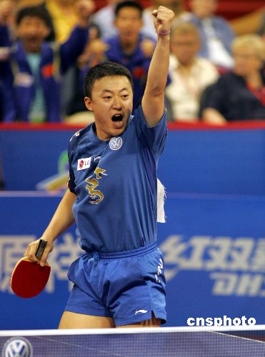 五月六日,在上海體育館進行的世乒賽男單半決賽中,中國選手馬琳以四比零輕取丹麥“黑馬”梅茲,與王勵勤會師男單決賽,這也使得中國隊在本屆世乒賽提前攬五冠。作者:湯彥俊