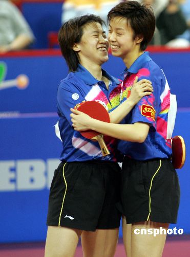 中新社上海五月六日電(記者劉立濤)第四十八屆世乒賽女子雙打決賽今晚結束,王楠/張怡寧以四比一擊敗另一對中國選手牛劍鋒/郭躍衛冕波普杯,巧合的是上一屆的女雙決賽也是在這兩對中國選手之間進行的,并有著同樣的結果。