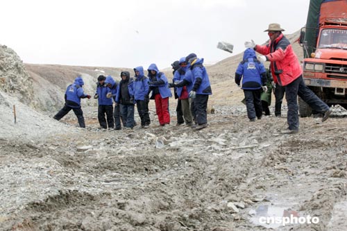 二零零五年五月十三日,穿越可可西里聯(lián)想鋒行探險隊傳遞石頭,為陷車的八噸大卡墊路。