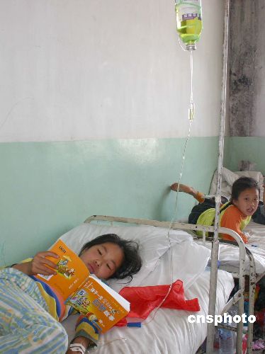 截至六月十四日,在黑龍江沙蘭鎮洪災中受傷入院的十七名學生已基本康復。圖為一名學生邊輸液邊閱讀故事書。作者:吳兆飛