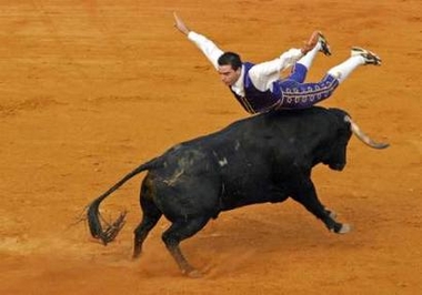 中新網(wǎng)6月21日電 據(jù)路透社報道,6月19日,在西班牙南部小城阿爾吉西拉斯舉行的斗牛節(jié)上,一名斗牛士正面飛身躍到一頭牛的身上。這種被稱為“recortadores”式的斗牛是古代流傳下來的傳統(tǒng),斗牛士在斗牛的時候不用斗篷或劍,牛也不會被殺死。(固山)