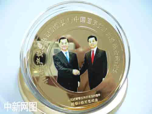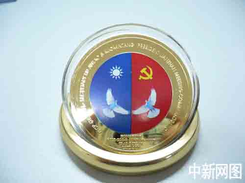 中新網6月22日電 香港金幣總公司在發行完“抗戰勝利60周年紀念幣”之后,日前又發行了一枚“歷史性的握手”紀念金銀幣。此幣正面是中國共產黨總書記胡錦濤與中國國民黨主席連戰在北京握手的彩色像,紀念幣的背面是國共兩黨的旗幟,旗下飛翔著和平鴿。