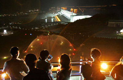 從明天起,斬?cái)嚅L(zhǎng)江的三峽大壩,每天將允許1000名普通游客把這個(gè)龐然大物“踩”在腳下!7月1日,三峽大壩壩頂將首次對(duì)游客開放,但今年的開放時(shí)間因施工需要到9月30日截止,到明年汛期再行開放。本報(bào)記者于昨日趕到壩區(qū)并星夜上壩,打探到壩頂旅游臺(tái)前幕后諸多細(xì)節(jié)。