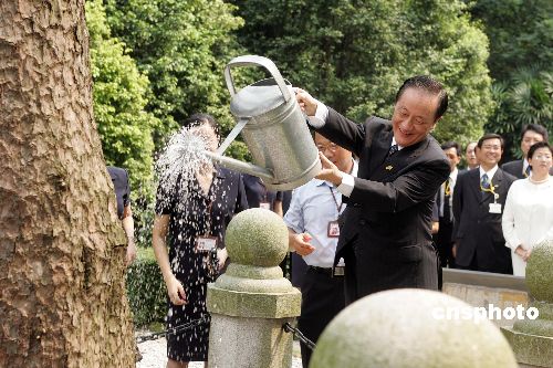 新黨主席郁慕明率領的新黨“民族之旅”訪問團七月七日拜謁廣州黃花崗七十二烈士陵園,并向一九一二年孫中山先生種下的馬尾松澆水培土。作者:毛建軍